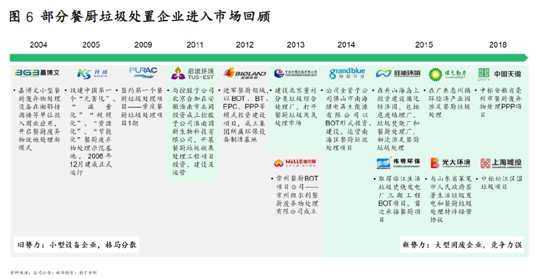 回顧我國餐廚垃圾處理行業(yè)的發(fā)展歷程,可以看到過去十幾年由于市場規(guī)模小、發(fā)展慢,并未引起足夠重視,主要是一些小型設(shè)備企業(yè)“小打小鬧”,市場比較分散,競爭并不激烈。不過近幾年,隨著垃圾分類帶來的需求激增,包括光大環(huán)境、中國天楹、上海城投等大型固廢企業(yè)紛紛進入,硝煙四起(見圖6)。