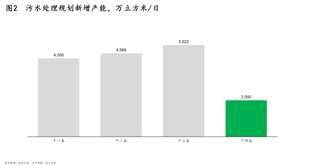 一是污水處理日漸成熟。近年我國城鎮(zhèn)污水處理任務(wù)已基本完成,城市污水處理率已經(jīng)達到95%以上,在“十四五”規(guī)劃中的污水處理新增產(chǎn)能也出現(xiàn)明顯下降(見圖2)。在污水處理漸趨飽和的情況下,先前遭到忽視的污泥處理問題重新得到關(guān)注。