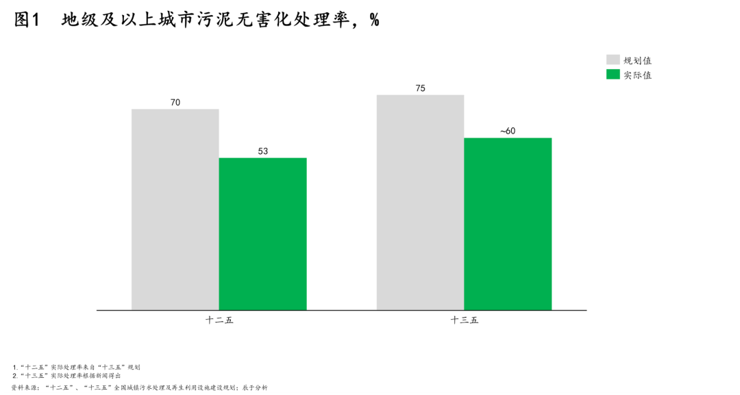 在此背景下,各級政府最終選擇先將污泥處理放一放,將有限資金優(yōu)先用于污水處理設(shè)施和管網(wǎng)建設(shè),這導(dǎo)致國內(nèi)“重水輕泥”的傾向明顯,“十二五”和“十三五”規(guī)劃中的地級及以上城市污泥無害化處理率目標兩次落空也就見怪不怪了(見圖1)。