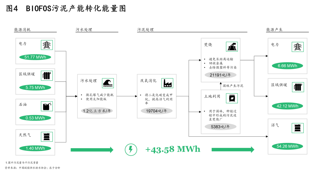 其二,30·60雙碳目標提出后,未來污泥處理處置將以節(jié)能降耗及能源資源回收為目標,這對污泥處理提出了更為清晰的技術(shù)路徑方向。例如在能源回收上,厭氧消化是優(yōu)選途徑,如丹麥污水廠BIOFOS通過污泥消化產(chǎn)能實現(xiàn)能量盈余(見圖4)。