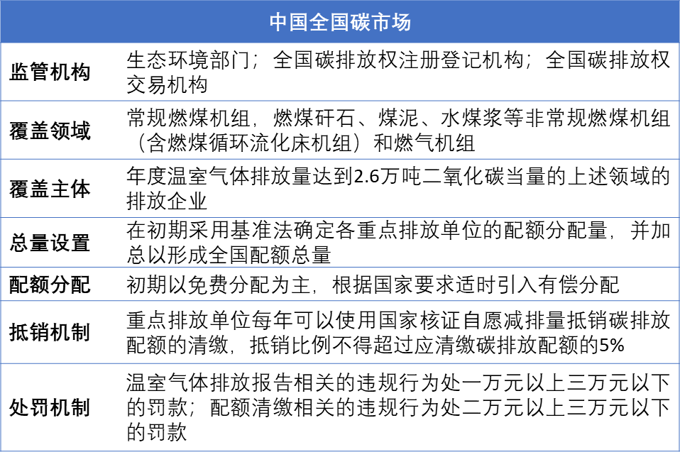 目前,中國的全國碳市場已經(jīng)進(jìn)入交易前的最后準(zhǔn)備階段。參考生態(tài)環(huán)境部發(fā)布的《2019-2020年全國碳排放權(quán)交易配額總量設(shè)定與分配實(shí)施方案(發(fā)電行業(yè))》、《碳排放權(quán)交易管理辦法(試行)》以及《碳排放權(quán)交易管理暫行條例(草案修改稿)》等文件,即將啟動(dòng)的全國碳市場將以生態(tài)環(huán)境部門為主要監(jiān)管機(jī)構(gòu)、覆蓋范圍為化石能源發(fā)電及發(fā)熱行業(yè)的二氧化碳排放,在初期通過基準(zhǔn)法確定各重點(diǎn)排放單位的配額分配量,并加總以形成全國配額總量。此外,初期的配額分配將以免費(fèi)分配為主,同時(shí)允許以國家核證自愿減排量抵銷碳排放配額,抵消比例不得超過應(yīng)清繳碳排放配額的5%。相關(guān)的機(jī)制設(shè)計(jì)見下表: