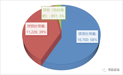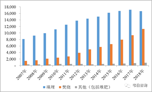 2018年,我國(guó)城市生活垃圾無(wú)害化處理量達(dá)到28,778萬(wàn)噸,其中填埋處理量16,700萬(wàn)噸,焚燒處理量11,226萬(wàn)噸,其他(包括堆肥)處理量851萬(wàn)噸。