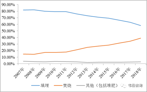 圖表5:2007年至2018年我國(guó)城市生活垃圾無(wú)害化處理方式占比變化情況