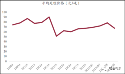 圖表12:2008-2019年新增垃圾焚燒發(fā)電項(xiàng)目?jī)r(jià)格變化趨勢(shì)(元/噸)