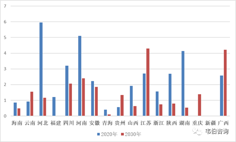 圖表14:截止2020年底和2030年底各省垃圾焚燒中長(zhǎng)期規(guī)劃新增項(xiàng)目數(shù)量(個(gè))