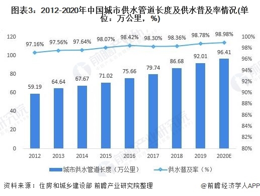 2019年我國(guó)城市供水管道長(zhǎng)度達(dá)92.01萬(wàn)公里,供水普及率達(dá)98.78%,2020年,我國(guó)城市供水管道長(zhǎng)度約為96.41萬(wàn)公里,供水普及率約為98.98%。