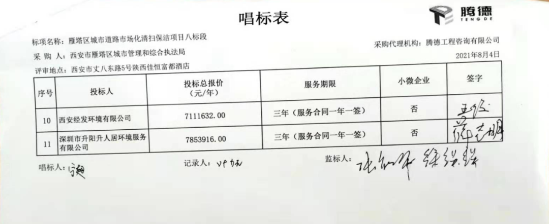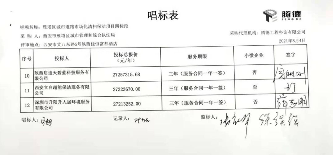 七標段共有10家投標企業(yè)參與報價,西安天天清洗有限責(zé)任公司勝出,成交價27,646,852元/年,服務(wù)期3年。