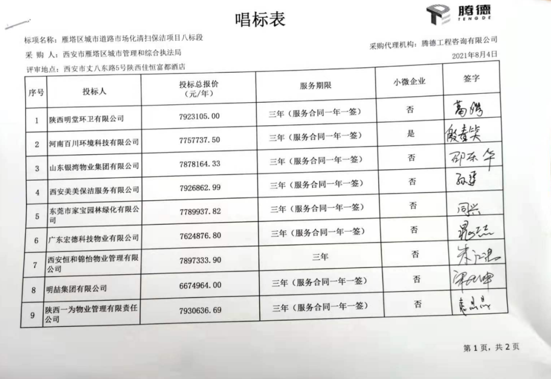附:西安市雁塔區(qū)城市道路市場化清掃保潔項目開標情況