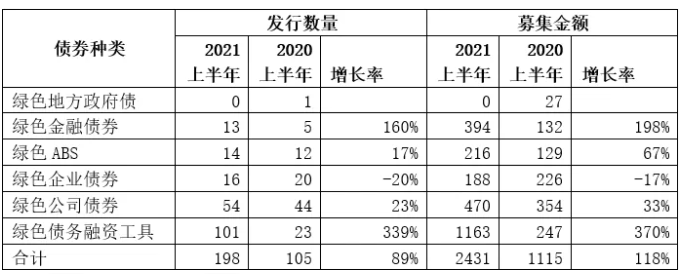 2021年上半年國內貼標綠色債券市場整體上行,新增發(fā)行綠色貼標債券198只,發(fā)行規(guī)模約2431億元,規(guī)模同比增長118%;占債券市場新發(fā)債券總額的1.33%,同比增長113.43%。從新增發(fā)行只數(shù)和規(guī)模增幅看,綠色債務融資工具、綠色金融債市場逐漸擴大,其中綠色債務融資工具新增發(fā)行101只,規(guī)模約1163億元,規(guī)模同比增長370%;綠色金融債新增發(fā)行13只,規(guī)模約394億元,規(guī)模同比增長198%;綠色ABS新增發(fā)行14只,規(guī)模約216億元,規(guī)模同比增長67%;綠色公司債券新增發(fā)行54只,發(fā)行規(guī)模約470億元,規(guī)模同比增長23%。此外,綠色企業(yè)債券市場相對滯緩,新增發(fā)行16只,發(fā)行規(guī)模約188億元,規(guī)模同比下降17%。
