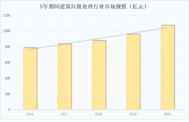 隨著建筑垃圾產(chǎn)量的提高,其處理市場(chǎng)也不斷擴(kuò)大。顯而易見(jiàn)的是,近五年來(lái)的市場(chǎng)規(guī)模整體呈上升趨勢(shì)。2017年突破了800億元,2019年已經(jīng)接近千億,2020年達(dá)到了1068.31億元。如果按此數(shù)據(jù)持續(xù)增長(zhǎng),到2021年,建筑垃圾市場(chǎng)規(guī)模有望達(dá)到1200億元。