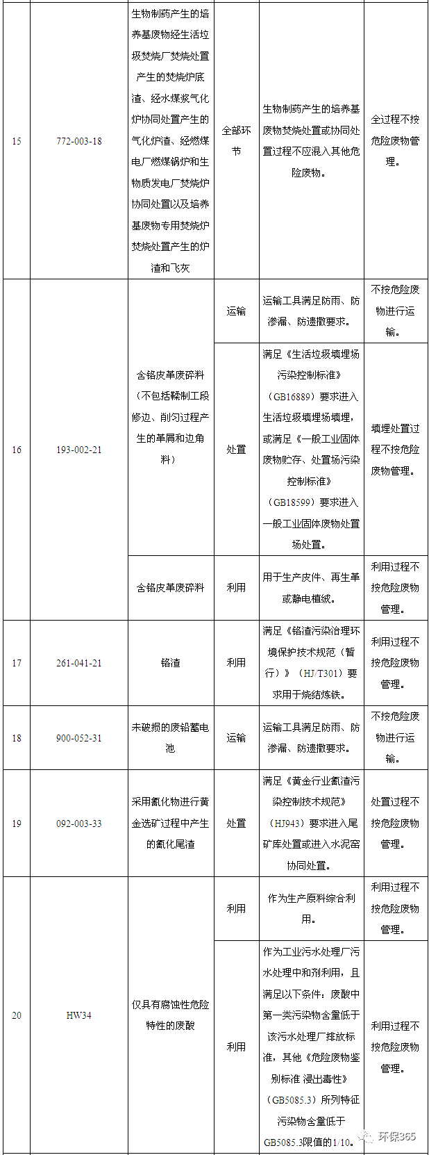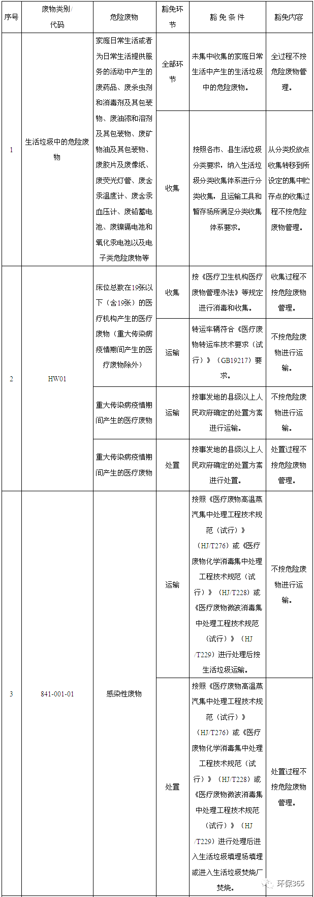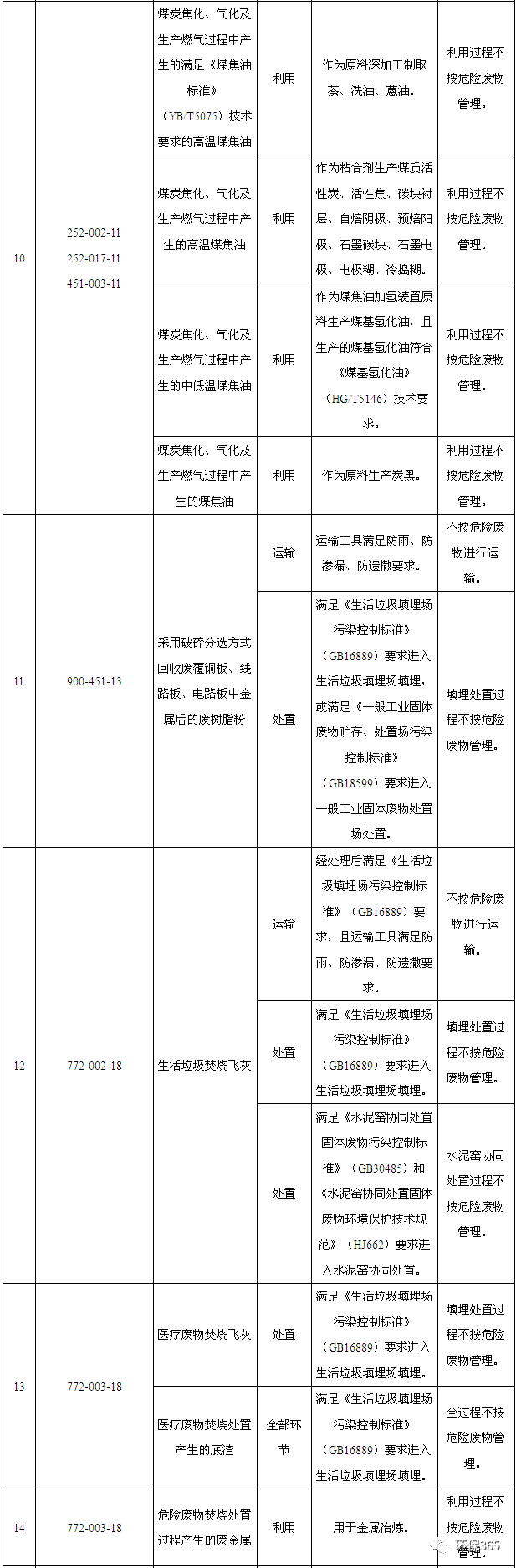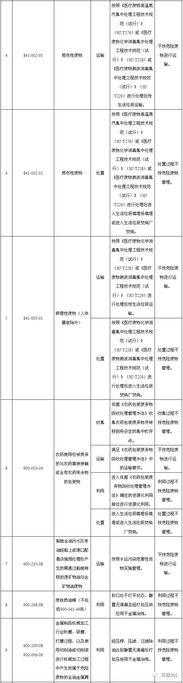 (1)家庭日常生活或者為日常生活提供服務的活動中產生的廢藥品、廢殺蟲劑和消毒劑及其包裝物、廢油漆和溶劑及其包裝物、廢礦物油及其包裝物、廢膠片及廢像紙、廢熒光燈管、廢含汞溫度計、廢含汞血壓計、廢鉛蓄電池、廢鎳鎘電池和氧化汞電池以及電子類危險廢物等未經過集中收集的全部環(huán)節(jié)不按危險廢物管理;按照各市、縣生活垃圾分類要求,納入生活垃圾分類收集體系進行分類收集,且運輸工具和暫存場所滿足分類收集體系要求的,從分類投放點收集轉移到所設定的集中貯存點的收集過程不按危險廢物管理。(2)床位總數(shù)在19張以下(含19張)的醫(yī)療機構產生的醫(yī)療廢物(重大傳染病疫情期間產生的醫(yī)療廢物除外)按《醫(yī)療衛(wèi)生機構醫(yī)療廢物管理辦法》等規(guī)定進行消毒和收集的,收集過程不按危險廢物管理;轉運車輛符合《醫(yī)療廢物轉運車技術要求(試行)》(GB19217)要求的,不按危險廢物進行運輸;重大傳染病疫情期間產生的醫(yī)療廢物,按事發(fā)地的縣級以上人民政府確定的處置方案進行運輸?shù)?,不按危險廢物進行運輸;按事發(fā)地的縣級以上人民政府確定的處置方案進行處置的,處置過程不按危險廢物管理。(3)感染性廢物按照《醫(yī)療廢物高溫蒸汽集中處理工程技術規(guī)范(試行)》(HJ/T276)或《醫(yī)療廢物化學消毒集中處理工程技術規(guī)范(試行)》(HJ/T228)或《醫(yī)療廢物微波消毒集中處理工程技術規(guī)范(試行)》(HJ/T229)進行處理后按生活垃圾運輸?shù)?,不按危險廢物進行運輸;按照《醫(yī)療廢物高溫蒸汽集中處理工程技術規(guī)范(試行)》(HJ/T276)或《醫(yī)療廢物化學消毒集中處理工程技術規(guī)范(試行)》(HJ/T228)或《醫(yī)療廢物微波消毒集中處理工程技術規(guī)范(試行)》(HJ/T229)進行處理后進入生活垃圾填埋場填埋或進入生活垃圾焚燒廠焚燒的,處置過程不按危險廢物管理。(4)損傷性廢物按照《醫(yī)療廢物高溫蒸汽集中處理工程技術規(guī)范(試行)》(HJ/T276)或《醫(yī)療廢物化學消毒集中處理工程技術規(guī)范(試行)》(HJ/T228)或《醫(yī)療廢物微波消毒集中處理工程技術規(guī)范(試行)》(HJ/T229)進行處理后按生活垃圾運輸?shù)?,不按危險廢物進行運輸;按照《醫(yī)療廢物高溫蒸汽集中處理工程技術規(guī)范(試行)》(HJ/T276)或《醫(yī)療廢物化學消毒集中處理工程技術規(guī)范(試行)》(HJ/T228)或《醫(yī)療廢物微波消毒集中處理工程技術規(guī)范(試行)》(HJ/T229)進行處理后進入生活垃圾填埋場填埋或進入生活垃圾焚燒廠焚燒的,處置過程不按危險廢物管理。(5)病理性廢物(人體器官除外)按照《醫(yī)療廢物化學消毒集中處理工程技術規(guī)范(試行)》(HJ/T228)或《醫(yī)療廢物微波消毒集中處理工程技術規(guī)范(試行)》(HJ/T229)進行處理后按生活垃圾運輸?shù)?,不按危險廢物進行運輸;按照《醫(yī)療廢物化學消毒集中處理工程技術規(guī)范(試行)》(HJ/T228)或《醫(yī)療廢物微波消毒集中處理工程技術規(guī)范(試行)》(HJ/T229)進行處理后進入生活垃圾焚燒廠焚燒的,處置過程不按危險廢物管理。(6)農藥使用后被廢棄的與農藥直接接觸或含有農藥殘余物的包裝物依據(jù)《農藥包裝廢棄物回收處理管理辦法》收集并轉移到所設定的集中貯存點的,收集過程不按危險廢物管理;滿足《農藥包裝廢棄物回收處理管理辦法》中的運輸要求的,不按危險廢物進行運輸;進入依據(jù)《農藥包裝廢棄物回收處理管理辦法》確定的資源化利用單位進行資源化利用的,利用過程不按危險廢物管理;進入生活垃圾填埋場填埋或進入生活垃圾焚燒廠焚燒的,處置過程不按危險廢物管理。(7)船舶含油污水及殘油經船上或港口配套設施預處理后產生的需通過船舶轉移的廢礦物油與含礦物油廢物按照水運污染危害性貨物實施管理的,不按危險廢物進行運輸。(8)廢鐵質油桶(不包括900-041-49類)封口處于打開狀態(tài)、靜置無滴漏且經打包壓塊后用于金屬冶煉的,利用過程不按危險廢物管理。(9)金屬制品機械加工行業(yè)珩磨、研磨、打磨過程,以及使用切削油或切削液進行機械加工過程中產生的屬于危險廢物的含油金屬屑經壓榨、壓濾、過濾除油達到靜置無滴漏后打包壓塊用于金屬冶煉的,利用過程不按危險廢物管理。(10)煤炭焦化、氣化及生產燃氣過程中產生的滿足《煤焦油標準》(YB/T5075)技術要求的高溫煤焦油作為原料深加工制取萘、洗油、蒽油的,利用過程不按危險廢物管理。煤炭焦化、氣化及生產燃氣過程中產生的高溫煤焦油作為粘合劑生產煤質活性炭、活性焦、碳塊襯層、自焙陰極、預焙陽極、石墨碳塊、石墨電極、電極糊、冷搗糊的,利用過程不按危險廢物管理。煤炭焦化、氣化及生產燃氣過程中產生的中低溫煤焦油作為煤焦油加氫裝置原料生產煤基氫化油,且生產的煤基氫化油符合《煤基氫化油》(HG/T5146)技術要求的,利用過程不按危險廢物管理。煤炭焦化、氣化及生產燃氣過程中產生的煤焦油作為原料生產炭黑的,利用過程不按危險廢物管理。(11)采用破碎分選方式回收廢覆銅板、線路板、電路板中金屬后的廢樹脂粉運輸工具滿足防雨、防滲漏、防遺撒要求的,不按危險廢物進行運輸;滿足《生活垃圾填埋場污染控制標準》(GB16889)要求進入生活垃圾填埋場填埋,或滿足《一般工業(yè
