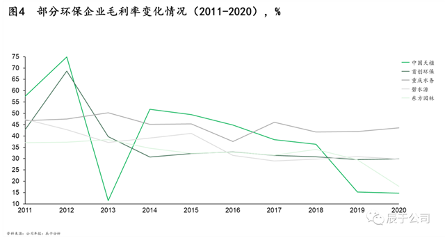 因此,地方政府一方面想辦法壓低項(xiàng)目盈利水平降低投入,一方面尋求其他“合法”融資渠道解困。近年來大型生態(tài)環(huán)保企業(yè)的盈利水平逐步下降印證了項(xiàng)目盈利降低的趨勢(見圖),盈利就幾個(gè)點(diǎn),融資成本極低的大型國企、央企在競爭中處于優(yōu)勢,幾個(gè)點(diǎn)的融資成本決定了項(xiàng)目的成與否;尋找融資渠道下,地方生態(tài)環(huán)保集團(tuán)應(yīng)運(yùn)而生,對跨市統(tǒng)籌、投資公益性回報(bào)比較差的項(xiàng)目等,將起到積極的作用。