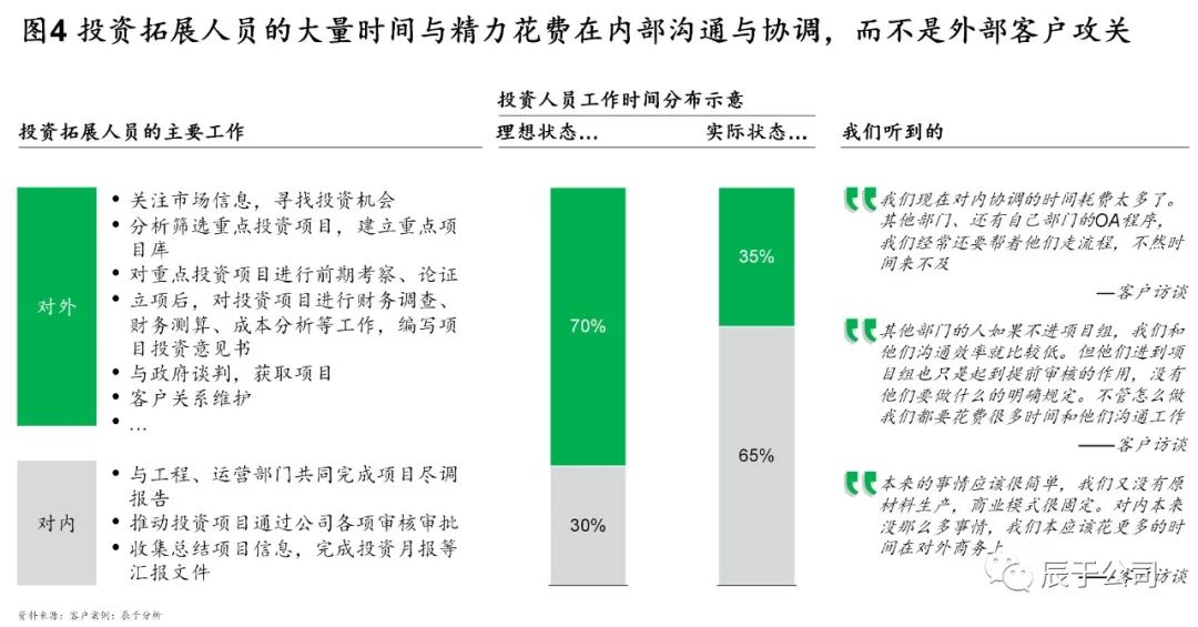 理想狀態(tài)下,對外對內(nèi)工作的時間分配比例應(yīng)該是7:3,甚至更高也不為過,但現(xiàn)實(shí)往往相反,由于內(nèi)部協(xié)同效率不高、流程繁冗、“人治”問題嚴(yán)重,我們發(fā)現(xiàn)一些投資拓展人員更多的時間與精力花費(fèi)在內(nèi)部溝通與協(xié)調(diào),而不是外部客戶攻關(guān)(見圖4)。造成這種現(xiàn)象的原因,表面看上去是內(nèi)部流程繁瑣,決策鏈條冗長,實(shí)則是內(nèi)部沒有形成一以貫之以市場為導(dǎo)向、以項(xiàng)目為核心的理念文化。平時大多只是喊喊口號而已,并未真正付諸行動。