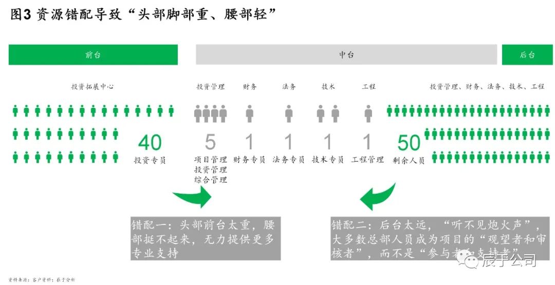 不難發(fā)現(xiàn),近年來一些企業(yè)開始“招兵買馬”,大量招聘投資拓展人員,這對于企業(yè)提高投資拓展能力自然是好事。不過我們也注意到,一些企業(yè)在投資相關(guān)的人員配置上卻不盡合理:他們通常把大量投資拓展人員“撒在前線”,同時建立“大后臺”,與投資相關(guān)的投管、財(cái)務(wù)、法務(wù),甚至技術(shù)、工程、運(yùn)營等人員主要負(fù)責(zé)項(xiàng)目質(zhì)量把關(guān)和風(fēng)險管控,只有少量人員在中臺為前臺提供“彈藥”和支持(見圖3)。這種“頭重腳重”帶來兩個“錯配”,一是頭部前臺太重,腰部挺不起來,無力提供更多專業(yè)支持;二是腳部后臺太遠(yuǎn),“聽不見炮火聲”,大多數(shù)人成為項(xiàng)目的“觀望者和審核者”,而不是“參與者和支持者”。