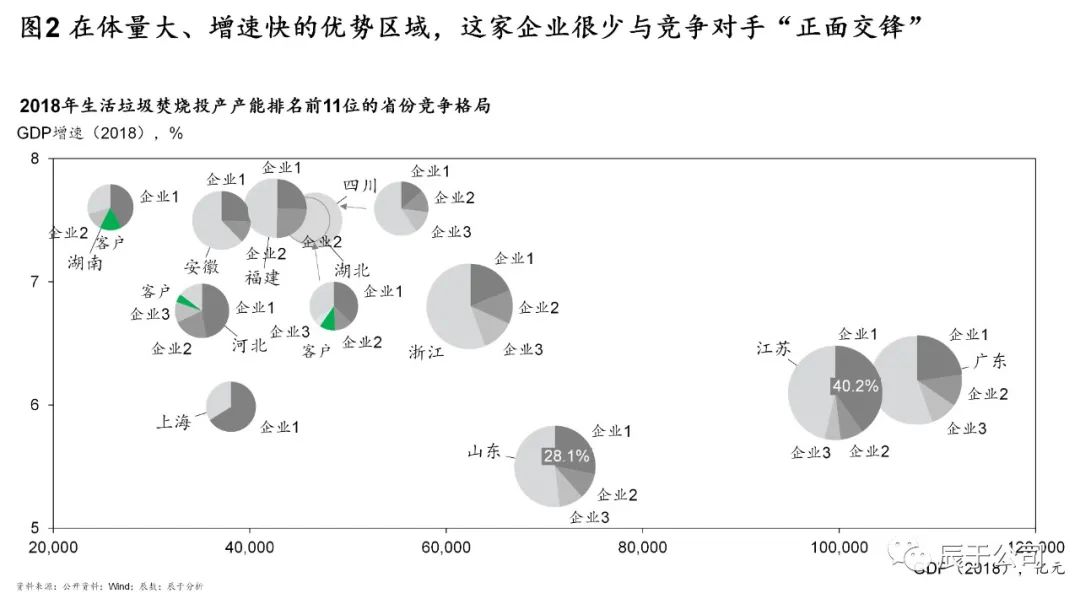 這是我們服務(wù)過的一家全國性生態(tài)環(huán)保企業(yè)的區(qū)域布局(見圖2,為保護(hù)隱私,數(shù)據(jù)已做處理),可以看到,在那些規(guī)模大、增速快的地區(qū),這家企業(yè)的市場占有率很低,盡管它的規(guī)模已位居全國前20強(qiáng)。這種“劍走偏鋒”其實(shí)反映出生態(tài)環(huán)保市場競爭的無奈:時至今日,“關(guān)系”似乎仍然是決定項(xiàng)目能否拿到手的最重要因素,技術(shù)、產(chǎn)品、運(yùn)營、品牌都不重要,但唯獨(dú)不能沒有關(guān)系。上述的這些區(qū)域正是這家企業(yè)的“關(guān)系”所在。