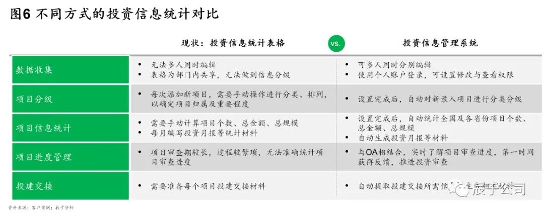 此外,我國生態(tài)環(huán)保產(chǎn)業(yè)數(shù)字化滲透率尚處于較低水平,即使是頭部企業(yè),也僅是在財(cái)務(wù)、行政、人力資源、工程等條線進(jìn)行了IT系統(tǒng)建設(shè),投資管理的IT系統(tǒng)建設(shè)很少,更別提利用大數(shù)據(jù)、機(jī)器學(xué)習(xí)、人工智能等先進(jìn)技術(shù)為投資決策提供支持了,不管是數(shù)據(jù)收集、還是項(xiàng)目分級、信息統(tǒng)計(jì)、進(jìn)度管理、投建交接等工作,基本依靠手動操作,效率低下且容易出錯(見圖6)。