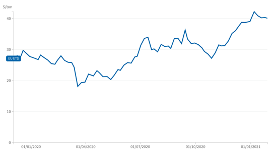 歐盟碳市場的穩(wěn)定結(jié)構(gòu)框架以及歐盟內(nèi)部長期政策的合理性在2020年的運(yùn)行中得到較好體現(xiàn)。2020年是歐盟碳市場第三階段運(yùn)行的最后一年,也是第四交易階段的密集準(zhǔn)備階段,碳價格在3、4月有短期大幅下降,從年初最高29.68美元降至4月最低18.04美元,但5月后價格又逐漸回升,并在7月達(dá)到33.89美元,此后一直在30美元左右徘徊,最后在同年12月達(dá)到42.16美元。在未來,歐盟《綠色新政》一攬子復(fù)蘇計劃以及《歐盟氣候法》中包含的2030年的新目標(biāo)將催生更大的氣候雄心,而碳市場的優(yōu)化改革將有助于實現(xiàn)這些氣候目標(biāo)。