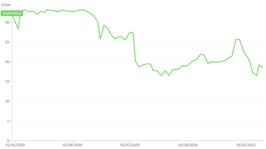 近兩年在韓國碳市場中,碳價持續(xù)處于波動狀態(tài)。2020年是韓國碳市場(K-ETS)運(yùn)行第二階段的最后一年,受新冠疫情影響, 2020年的價格波動更加劇烈。碳價格在2020年4月初達(dá)到頂峰(35.92美元),然后從5月開始大幅下降至16.95美元,8月開始反彈至12月初達(dá)到25.84美元,12月末又有所回落(19.49美元)。2020年9月,韓國總統(tǒng)文在寅宣布將在2050年之前實現(xiàn)凈零排放的長期目標(biāo),預(yù)計將在未來幾年更新氣候政策框架,促進(jìn)對低碳技術(shù)的投資。