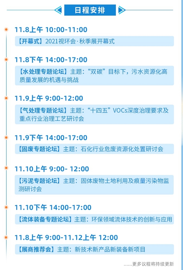 2021視環(huán)會·秋季展(第4屆)將于11月8—12日線上開展,同期開幕式、多場相關(guān)主題交流會議、活動、新品發(fā)布會等將輪番舉行。本屆視環(huán)會同期在線論壇將以“創(chuàng)新助力高質(zhì)量發(fā)展 共謀環(huán)保產(chǎn)業(yè)‘雙碳’發(fā)展路徑”為主題,圍繞:市政污水處理、污泥處理處置、膜技術(shù)與高難度廢水處理、VOCs處理及大氣污染防治、環(huán)境監(jiān)測與服務(wù)、固體廢物資源化利用與處置、智慧節(jié)能等領(lǐng)域?qū)n}進行探討。