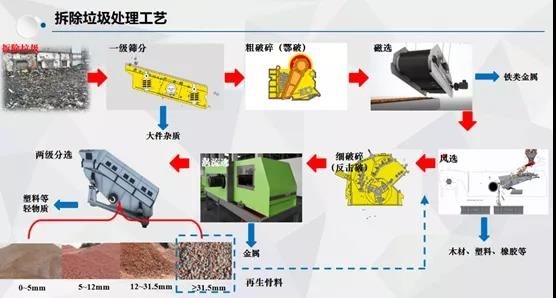 拆除垃圾的處理工藝,確定為“兩級破碎+兩級篩分+兩級風選”。先經過一級篩分設備將大件雜質去掉,然后經過第一級粗破碎——鄂破,再用磁選,把鐵類金屬選出來,然后進行風選,把木材、塑料、橡膠等物質篩出來。之后進入二破——反擊破,再通過渦電流分選,把非鐵類金屬選出來,接下來進行兩級篩分及風選,分出再生骨料,可以結合后端利用途徑,分成不同粒徑集配的骨料。