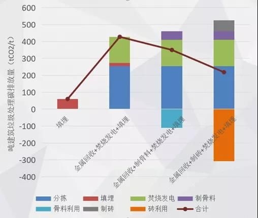 生命周期視角下,不同建筑垃圾處理工藝的碳排放有哪些不同呢?余毅介紹,對填埋、金屬回收、制骨料、制磚、雜質焚燒等工藝組合進行生命周期視角的碳排放計算發(fā)現,建筑垃圾填埋碳排放量最低;制磚工藝比制骨料工藝碳排放總量低。