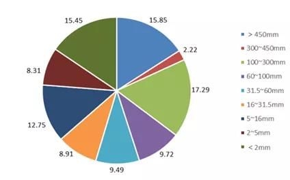 從不同粒徑角度,來分析拆除垃圾和裝修垃圾,可以看出,兩類垃圾的粒徑范圍比較大。其中粒徑大于450mm的大塊物料以及小于2mm的粉狀物料占比相對較多,這兩類物料加起來超過了三分之一。