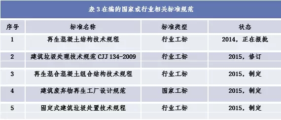 目前,建筑垃圾管理與資源化標準體系正在建設中,現(xiàn)有的建筑垃圾資源化利用及再生產品生產與應用相關國家及行業(yè)標準規(guī)范有11項,在編的相關標準規(guī)范有5項(詳見表2、表3),其中強制性標準條文不多,在某種程度上制約了再生產品的生產、使用和推廣。