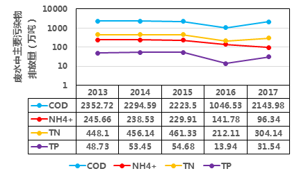 根據(jù)2013-2017年《中國(guó)統(tǒng)計(jì)年鑒》,我國(guó)廢水排放總量保持在700億噸,其中廢水中COD、氨氮(NH4+)、總氮(TN)、TP排放量如下圖,可見(jiàn)2015年國(guó)務(wù)院發(fā)布了《水污染防治行動(dòng)計(jì)劃》(簡(jiǎn)稱“水十條”)后,這幾種污染物排放量得到了削減。