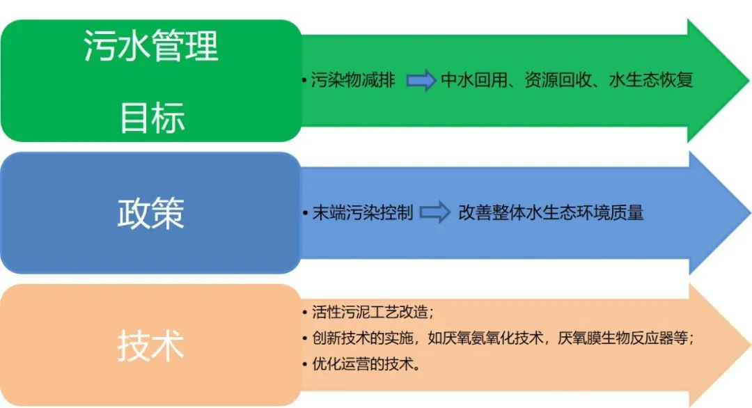 近幾十年來(lái),中國(guó)污水行業(yè)經(jīng)歷了高速增長(zhǎng),在基礎(chǔ)設(shè)施建設(shè)、技術(shù)創(chuàng)新、人才培養(yǎng)等方面取得了進(jìn)步,為未來(lái)的智慧化、低碳化、資源化發(fā)展奠定了堅(jiān)實(shí)的基礎(chǔ)。然而,未來(lái)仍然充滿不確定性和挑戰(zhàn)。預(yù)計(jì)隨著人口的持續(xù)增長(zhǎng)和城市化進(jìn)程,水資源短缺將更加嚴(yán)重,而污水量將進(jìn)一步增加。這將要求污水管理目標(biāo)、政策和技術(shù)發(fā)生根本性變化,如下圖: