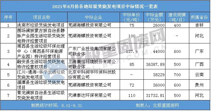 8月垃圾焚燒發(fā)電項目中標匯總?cè)缦拢?/span>