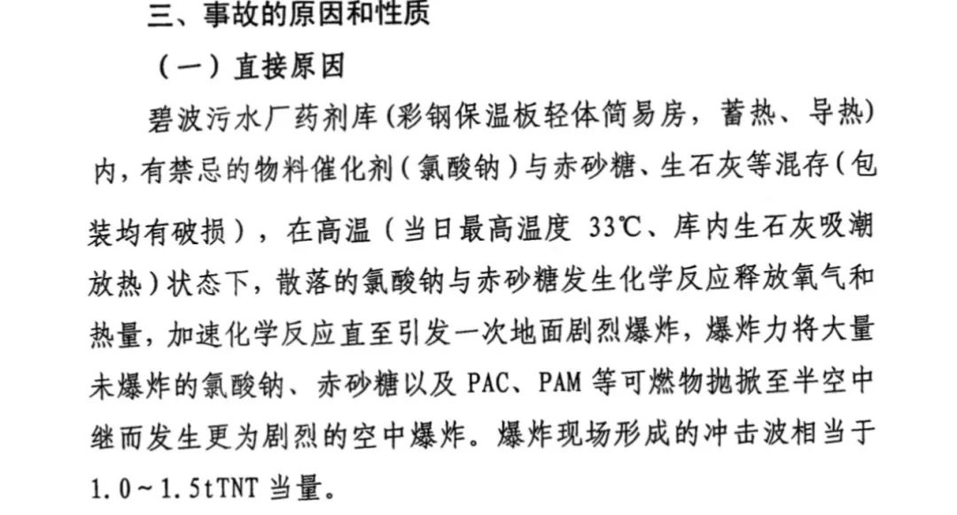 而之所以發(fā)生爆炸,正是與這些氯酸鈉有關(guān)。原來,碧波污水廠的藥劑庫為彩鋼保溫板輕體簡易房,容易蓄熱、導(dǎo)熱。由于里面儲存的氯酸鈉、赤砂糖、生石灰等化學(xué)品混存,且包裝均有破損。結(jié)果在高溫的狀態(tài)下,散落的氯酸鈉與赤砂糖發(fā)生化學(xué)反應(yīng),引發(fā)了第一次地面劇烈爆炸。