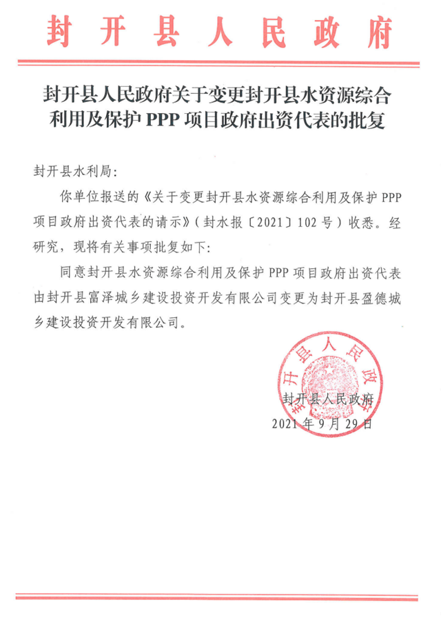 4、封開縣人民政府關(guān)于變更封開縣水資源綜合利用及保護PPP項目政府出資代表的批復