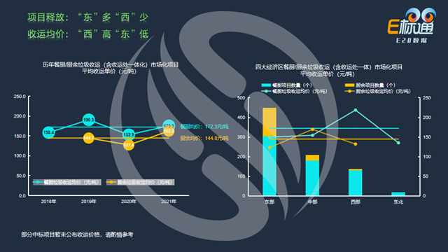 聚焦收運(yùn)環(huán)節(jié),近三年餐廚垃圾收運(yùn)均價為172.3元/噸,廚余垃圾收運(yùn)均價為144.8元/噸,左圖是歷年餐廚/廚余垃圾收運(yùn)(含收運(yùn)處一體化)市場化項(xiàng)目平均收運(yùn)價格的情況;右圖是四大經(jīng)濟(jì)區(qū)餐廚/廚余垃圾平均收運(yùn)單價情況,其中:西部地區(qū)的餐廚垃圾收運(yùn)均價較高,中部地區(qū)廚余垃圾的收運(yùn)價格較高,E20研究院數(shù)據(jù)研究中心認(rèn)為中西部地區(qū)收運(yùn)價格偏高或與收運(yùn)距離有關(guān)。