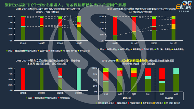 從社會資本維度看,上兩圖分別是按照項(xiàng)目數(shù)量和建設(shè)投資總額兩個維度的餐廚垃圾處理處置投資運(yùn)營類項(xiàng)目中標(biāo)社會資本情況占比圖。民企每年拿到的餐廚投運(yùn)項(xiàng)目的一半,并且所占的市場份額在逐年上升。左下面圖是廚余垃圾處理處置投資運(yùn)營類項(xiàng)目中標(biāo)社會資本情況。