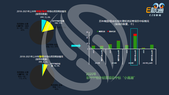 對餐廚/廚余垃圾PPP和非PPP特許經(jīng)營類市場化項(xiàng)目進(jìn)行分析。右圖是歷年餐廚/廚余垃圾投資運(yùn)營類項(xiàng)目的中標(biāo)情況,2020年非PPP特許經(jīng)營項(xiàng)目存在中標(biāo)的“小高峰”,E20研究院執(zhí)行院長、湖南大學(xué)兼職教授薛濤曾在“2020(第十四屆)固廢戰(zhàn)略論壇”上做題為《“十四五”固廢行業(yè)規(guī)劃與產(chǎn)業(yè)趨勢前瞻》的主旨演講,其中講到環(huán)衛(wèi)和焚燒等細(xì)分領(lǐng)域同樣迎來非PPP特許經(jīng)營項(xiàng)目的一個中標(biāo)小高峰。但不同服務(wù)模式的項(xiàng)目合規(guī)與否、合理與否,薛院長在演講中做了詳細(xì)的各細(xì)分領(lǐng)域合理合規(guī)的邏輯分析。