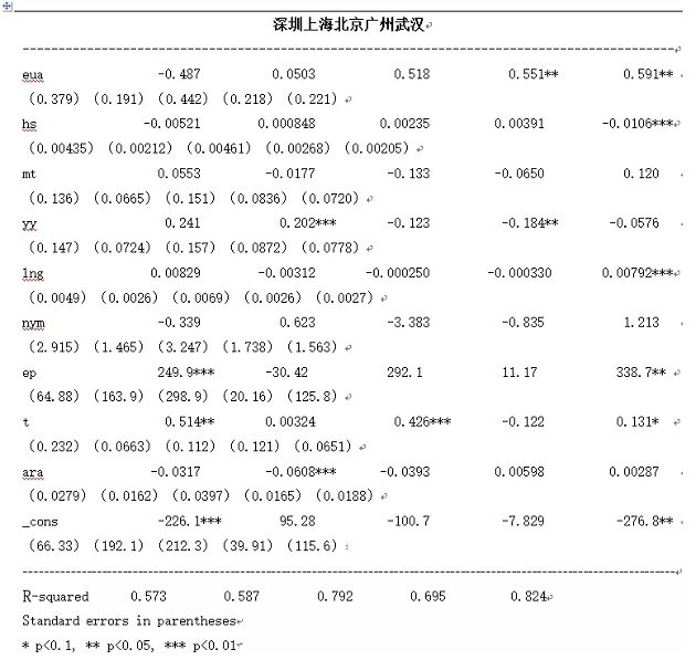 在篩選掉缺失數(shù)據(jù)并統(tǒng)一時間與貨幣單位后,本文最終對深圳、上海、北京、廣東、以及湖北在2017年1月至2021年1月這四年間的日度數(shù)據(jù)進(jìn)行回歸。研究發(fā)現(xiàn),五次回歸模型在F檢驗(yàn)中的P值均<0.01,可見此模型均在0.01水平上是有效的。其次,深圳、上海、北京、廣東、以及湖北在以一系列應(yīng)變量的回歸模型中R方分別為0.5730、0.5871、0.7920、0.6952、0.8243,盡管相對于宏觀層面R方的大小并不是很大,但具有一定的解釋意義。
