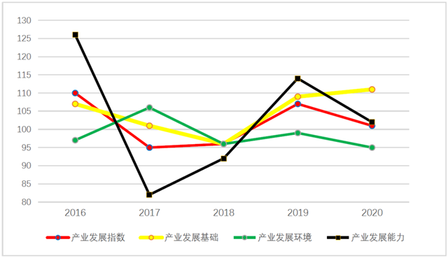 圖2“十三五”期間我國環(huán)保產(chǎn)業(yè)發(fā)展指數(shù)及一級指標變化趨勢