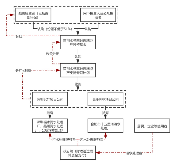 首創(chuàng)環(huán)保作為A股首家以綠色PPP項目為底層資產之一發(fā)行基礎設施REITs項目的上市公司,其通過公募基金-資產支持專項計劃-項目公司-基礎設施項目的結構將綠色PPP資產納入REITs產品中。