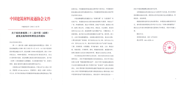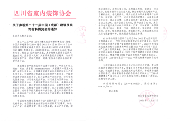 第二十二屆中國(成都)建筑及裝飾材料博覽會(以下簡稱:第二十二屆中國成都建博會)將于2022年4月14-16日在中國西部國際博覽城舉辦,15萬平米展出面積、預計1700+展商、120000參觀人次,目前展位預定已超85%。為打造“經(jīng)銷代理”與“公裝集采”的優(yōu)選商貿(mào)平臺,本屆展會現(xiàn)在已全渠道全面開啟線上線下宣傳推廣、專業(yè)觀眾邀請,深度覆蓋以四川為中心的西南各省市,觀眾群體涵蓋建材家居行業(yè)生產(chǎn)廠商、經(jīng)銷代理商、零售商、設計師、裝飾工程、開發(fā)商、建筑工程等,滿足參展企業(yè)招經(jīng)銷代理需求的同時更助力參展企業(yè)實現(xiàn)公裝集采貿(mào)易對接。