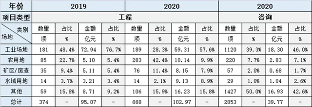 2019-2020年工程及咨詢項目不同用地類型的項目數(shù)量和項目金額分析