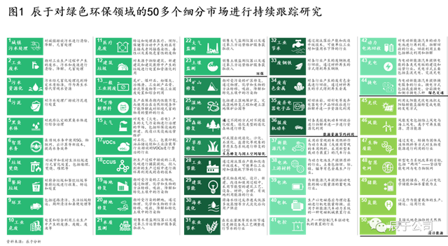 作為一家聚焦于綠色發(fā)展領域的專業(yè)咨詢機構(gòu),結(jié)合以往項目經(jīng)驗以及業(yè)內(nèi)習慣,辰于對綠色環(huán)保行業(yè)范圍進行了明確劃分,目前已經(jīng)持續(xù)跟蹤50多個細分領域(見圖1)。有意思的一點是,過去的環(huán)保行業(yè)范圍一般是指包含供水、各類污染物末端處置和治理以及環(huán)境監(jiān)測在內(nèi)的傳統(tǒng)環(huán)保領域,雙碳戰(zhàn)略提出后,當人們談到“環(huán)保”時,更多是指“綠色環(huán)保”的概念,節(jié)能、清潔能源、雙碳業(yè)務等行業(yè)也被納入。