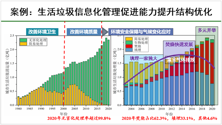 產(chǎn)生多少固廢都不清楚的情況下怎么計算減碳?劉建國表示,固廢治理首先需要借助新一代信息化技術(shù)把底數(shù)摸清楚。城市生活垃圾板塊就做了很好的示范,數(shù)據(jù)從過去的粗放狀態(tài)到近年越來越逼近真實,數(shù)據(jù)呈現(xiàn)也越來越清晰。2020年城市生活垃圾無害化處理率超過99.8%,其中焚燒占比62.3%,填埋33.1%,其他4.6%,城市生活垃圾處理方式從填埋一家獨大到焚燒快速發(fā)展再到現(xiàn)在多元并舉,管理水平的提升帶來了垃圾處理方式的進(jìn)步,從最初環(huán)境衛(wèi)生問題的解決到環(huán)境質(zhì)量問題的解決,再到現(xiàn)在環(huán)境安全問題和氣侯變化的應(yīng)對,其中精細(xì)化管理和信息化管理發(fā)揮了很重要的作用。