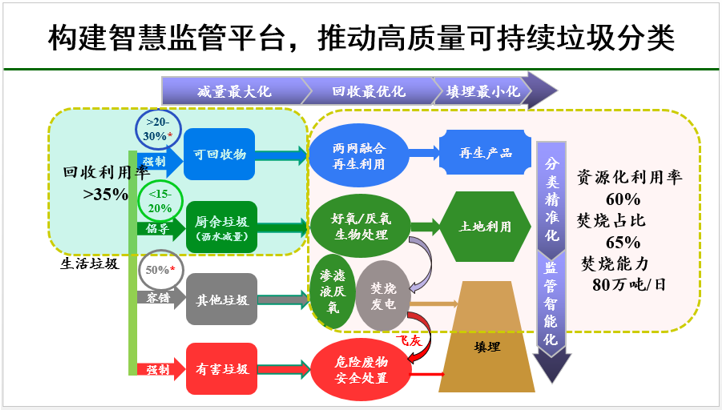 三是,構(gòu)建智慧監(jiān)管平臺,推動高質(zhì)量可持續(xù)垃圾分類。垃圾分類靠過去粗放管理方式不可能實現(xiàn)全覆蓋,必須要借助于信息化手段。要達(dá)成“十四五”規(guī)劃中提到的生活垃圾資源化利用率60%的目標(biāo),生活垃圾就要做到減量最大化、回收最優(yōu)化、填埋最小化,而這些依賴于分類精準(zhǔn)化,說到底要靠監(jiān)管智能化來實現(xiàn)。