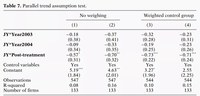 文章中的表3顯示了構(gòu)建合成江陰市的其他城市的貢獻權(quán)重。很明顯,常熟和吳江提供了最有用的信息,而邳州、宜興和東臺也做出了一定的貢獻。因此,在公司層面的分析中,作者將這五個城市中的公司作為DiD分析的對照組。