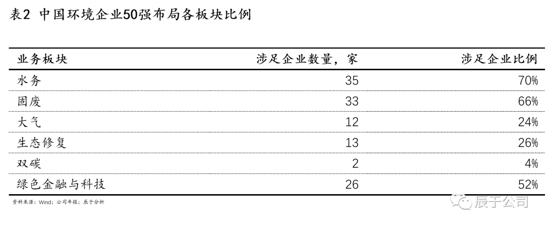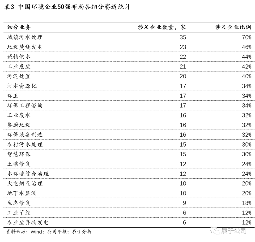 更細分去看,城鎮(zhèn)污水處理、垃圾焚燒發(fā)電、城鎮(zhèn)供水、工業(yè)危廢等是中國環(huán)境企業(yè)50強布局最多的細分領(lǐng)域(見表3),這些領(lǐng)域基本都是規(guī)模上千億甚至數(shù)千億的市場,“盤子”足夠大,商業(yè)模式穩(wěn)定,是環(huán)境強企必爭之地。