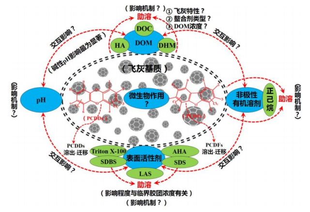 相關(guān)研究表明,溶解性有機(jī)物(DOM):如DOC(溶解性有機(jī)碳),DHM(溶解性腐殖類物質(zhì))和HA(腐殖酸類)等、pH、表面活性劑、非極性有機(jī)溶劑和微生物作用對(duì)飛灰中二噁英的溶出均有一定的影響。填埋處置環(huán)境中影響飛灰中PCDD/Fs溶出的主要因素及其相互作用關(guān)系如圖2所示。 圖2 填埋處置環(huán)境中影響飛灰中PCDD/Fs溶出的主要因素及其相互作用關(guān)系
