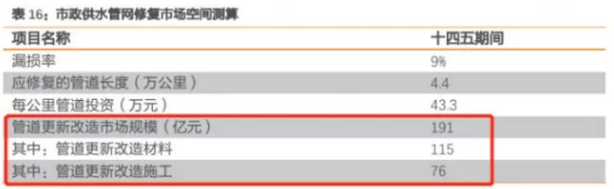 有機(jī)構(gòu)預(yù)測稱,“十四五”期間供水管網(wǎng)更新改造帶來的市場空間有望達(dá)191億元。
