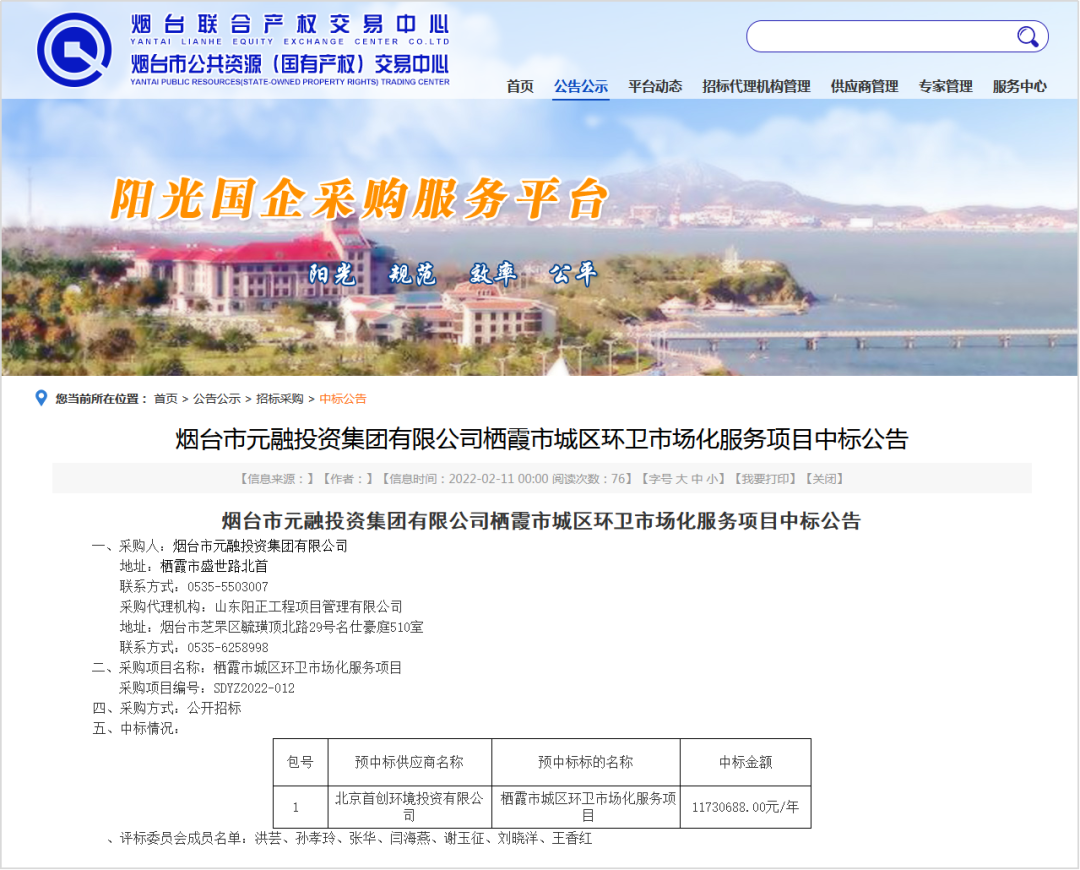 煙臺市公共資源(國有產(chǎn)權)交易中心消息,2022年2月11日,煙臺市元融投資集團有限公司棲霞市城區(qū)環(huán)衛(wèi)市場化服務項目開標,中標結果如下: