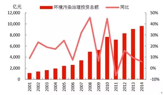 從國家統(tǒng)計局的數(shù)據(jù)可以看到,我國在環(huán)境污染治理方面的投資量,呈現(xiàn)上升趨勢,2014年達(dá)到9576億元;近年占GPD的比重維持在1.5%左右,較2001年提升約0.5個百分點。發(fā)改委、環(huán)保部印發(fā)《關(guān)于培育環(huán)境治理和生態(tài)保護(hù)市場主體的意見》,提出目標(biāo),“十三五”綠色環(huán)保產(chǎn)業(yè)產(chǎn)值年均增長15%以上,遠(yuǎn)高于CDP的增長目標(biāo),為經(jīng)濟(jì)增長注入動力。