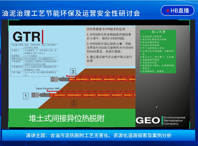 本次研討會(huì)上陳曉松博士也帶來了《含油污泥熱脫附工藝無害化、資源化道路探索及案例分析》的分享。陳博士重點(diǎn)介紹了GEO公司的堆土間接熱脫附技術(shù),堆土間接熱脫附技術(shù)也是原位脫附技術(shù)的翻版,核心技術(shù)原理上是一致的。堆土間接熱脫附技術(shù)首先會(huì)將污染土堆成一個(gè)土堆,在外圍圍上隔熱板,然后插入加熱井和抽提井,加熱井連接燃燒器及空氣,抽提井連接地表尾氣處理設(shè)備。